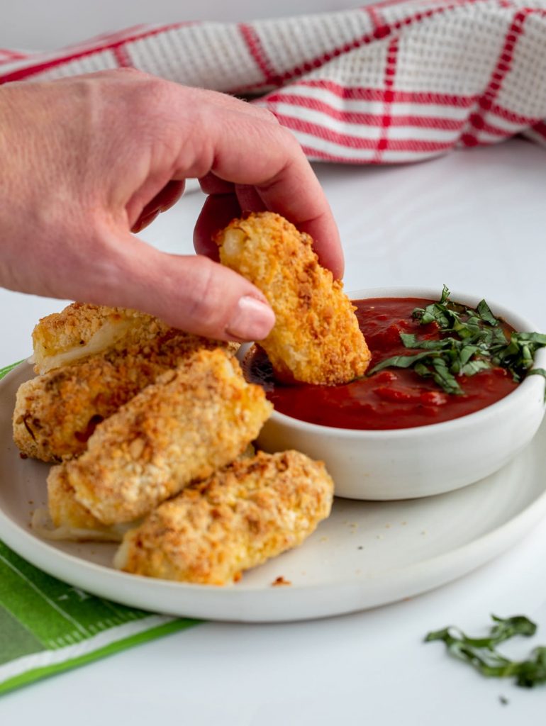 *Please note that I had the most success with the pan frying method. Both baking and the air fryer method yielded some mozzarella sticks with cheese that leaked out and melted before the coating was golden